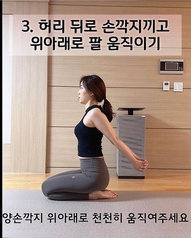 허리 뒤로 손깍지 끼고 위아래로 천천히 움직여주세요 10회 진행