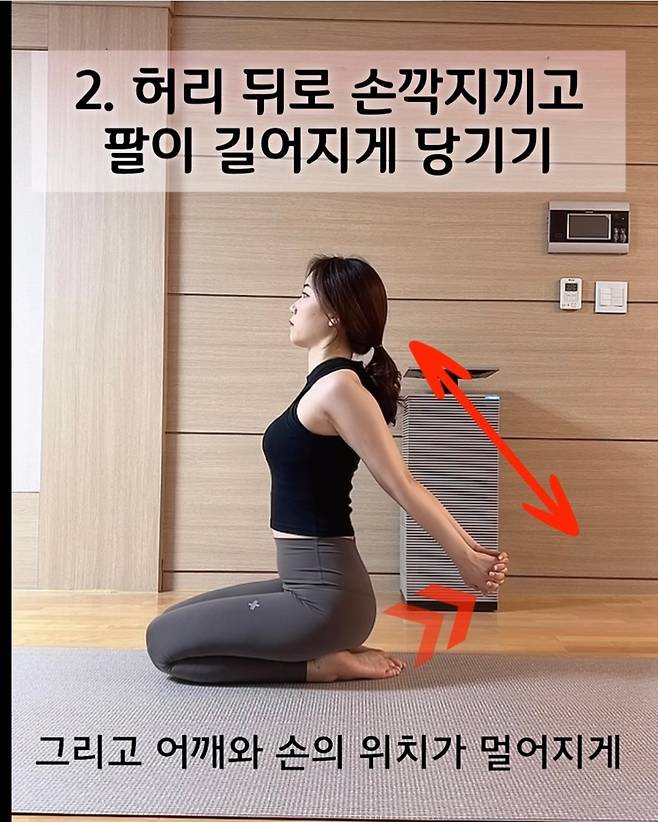 양손을 허리 뒤로 손깍지 끼고 두 팔을 쭉 펴줍니다.