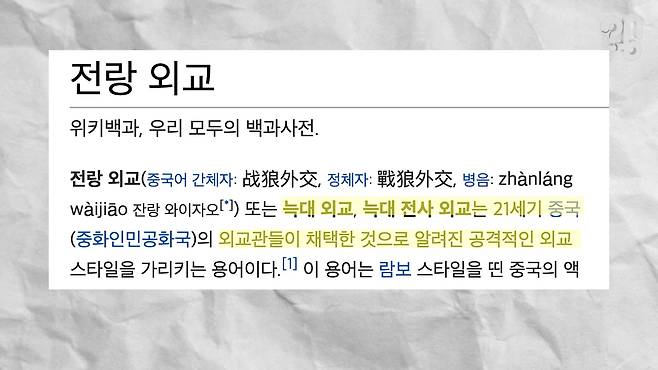 "‘늑대외교’라는 거 있잖아요. ‘늑대외교’라는 게 중국 대사들이 자기네가 주재하는 국가에서 중국한테 부정적인 멘트를 하면 거기 적극적으로 대처해서 막 대항하고 그랬거든요. 사실 외교관들이 그렇게 안하는데 중국 사람들은 굉장히 강하게 하니까 늑대전사외교라고 하는데 그런 것들이 국제사회에서 중국의 평판을 굉장히 많이 깎아먹었어요."
