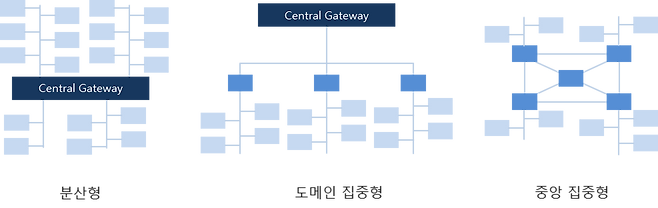 차량의 제어기 아키텍처는 위의 그림과 같이 분산형, 도메인 집중형, 중앙 집중형으로 구분할 수 있다. 전통적인 자동차 제조사들이 분산형을 채택하고 있으며, Central Gateway를 중심으로 기능에 따라 제어기들이 분산되어 있다. 도메인 집중형은 각 기능을 대표하는 마스터 제어기가 중재자 역할을 하는 것이다. 중앙 집중형은 최대한 기능을 통합 시키고 통합된 소수의 제어기가 시스템을 제어하는 것이다.
