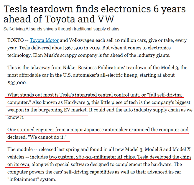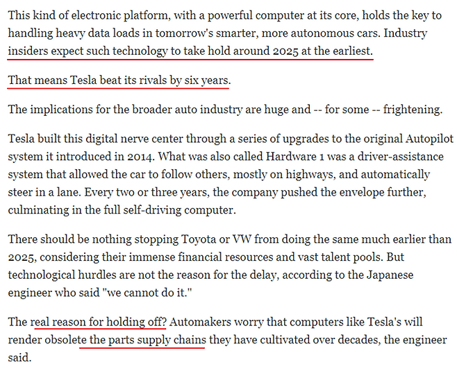 원문 기사의 핵심은 테슬라의 통합형 중앙 제어기와 FSD HW3.0 제어기에 주목해야 하며, 테슬라의 자율주행, OTA, 배터리, 차량 제조 기술도 뛰어나지만 제어기 플랫폼에도 주목해야 한다는 내용이다. 통합형 제어 기술은 2025년에는 가능할 것으로 보이기에 테슬라가 토요타 보다 6년을 앞서 나간다고 해석을 한 것이다. 또한 이 기사에서 테슬라가 이렇게 할 수 있던 비결로는 신생기업으로 부품 업체와 연결된 공급망으로부터 자유롭기 때문이라 해석했으며, 반면 토요타나 폭스바겐은 기존에 협력을 진행했던 업체와의 서플라이 체인을 끊기 어렵기 때 문이라 밝혔다.
