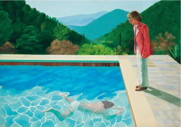 산뜻하게 차려입은 남성이 수영장 가장자리에서 수영하는 사람을 내려다보고 있다. 햇빛에 일렁이는 수면, 남성의 고급스러운 옷차림, 잘 정리된 수영장과 그 뒤로 펼쳐지는 경치 좋은 산이 쨍한 햇빛과 맞물려 완벽한 오후를 만들어낸다. 하지만 서 있는 남성의 표정은 밝지 않다. 무언가 쓸쓸함도 느껴진다. 수영하는 사람의 표정이 궁금해진다. 영국의 팝아트 거장 데이비드 호크니(85)의 ‘예술가의 초상(Portrait of an Artist)’이다.