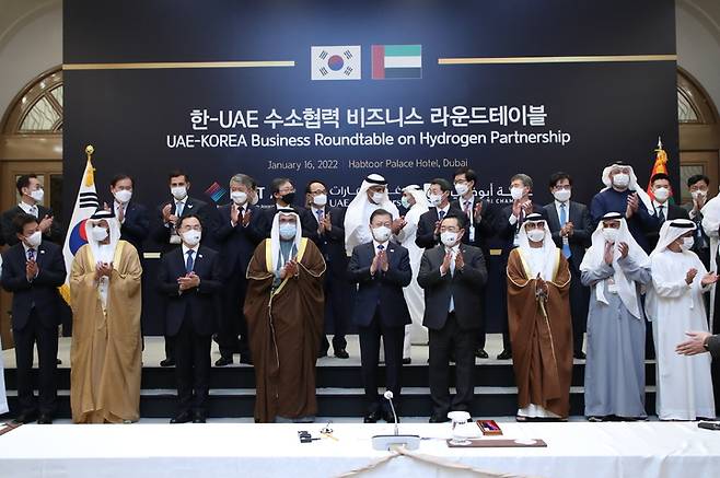 [두바이=뉴시스] 김진아 기압둘라자 = 문재인 대통령이 16일(현지시간) 아랍에미리트 두바이 한 호텔에서 열린 한-UAE 수소협력 비즈니스 라운드 테이블에서 구자열 무역협회장, 압둘라 모하메드 알 마즈로이 UAE연방상공회의소 회장 등 참석자들과 기념촬영을 하고 있다. 2022.01.16. bluesoda@newsis.com