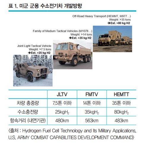 미군의 수소연료전지 군용차량 개발에는 <표 1>과 같이 JLTV, FMTV(Family of Medium Tactical Vehicles), HEMTT(Heavy Expanded Mobility Tactical Truck)에 대하여 단계적으로 개발 전략이 제시하고 있다. 차량별로 수소충전량은 JLTV 25kgH2로, FMTV 35kgH2, HEMTT 80kgH2으로 충전량을 설정하고 있다.