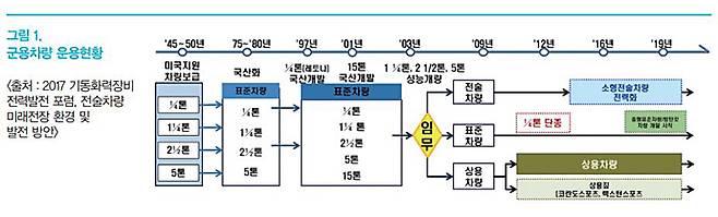 베트남 파병이후 미국으로부터 군용차량을 공여받아 지금의 군용차량으로 이어져 오고 있으며 공여받은 군용차량은 1975년도에 국산 군용차인 K-100(¼톤), 1978년에는 K111 (¼톤)과 K-511(2½톤 트럭), 그리고 1980년에 K-311(1¼톤 트럭) 군용차량 운용을 시작하였다. 현재 군용차량으로 운용되는 차종은 ¼톤, 1¼톤, 2½톤, 5톤, 15톤으로 차종별로 계열차량과 트레일러가 운용되고 있다. 2012년부터 1/4톤(K131)단종에 따라 최소개조 상용짚이 운용되고 있으며 2016년 소형 전술차량의 개발로 군용차량은 전술차량, 표준차량, 상용차량이 운용되고 있다<그림 1>.