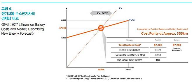 전기차와 수소전기차의 비용분석 자료 <그림 4>를 살펴보면 승용 SUV급 전기차와 수소전기차의 1회 충전 주행 가능 거리-시스템 비용 비교에서 1회 충전거리는 355km에서 비용균형점이 형성된다. 주행에 필요한 전기차의 배터리 용량은 65.4kWh로 시스템 비용은 7,200달러(865만원)이고 수소전기차는 연료전지 100kw급의 비용은 4,522달러(547만원)로 소요된다. 전기차와 수소전기차 비용을 배터리와 연료전지 관점에서 1회충전 주행거리 355km에서는 동일한 비용이 들어간다. 1회 주행거리가 낮은 전기차일 수록 355km 이하에서 수소전기차 대비 낮은 시스템비용으로 운용가능하며 1회 충전거리 355km 이상에서는 수소전기차가 전기차에 비해 경제적이다. 전력화된 군용차량 항속거리는 1¼톤 450km, 2½톤 600km, 5톤 600km로 수소전기차를 활용한 군용화가 전기차를 활용한 군용화보다 기존의 운용개념을 연계하는데에 적합하다.