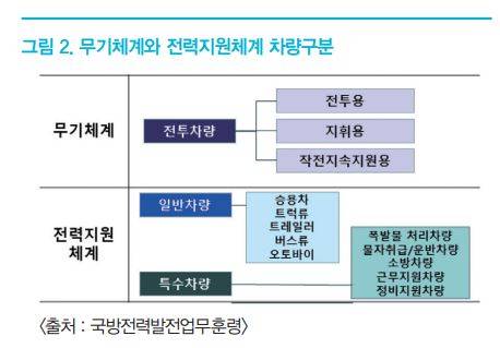 군용차량은 <그림 2>와 같이 무기체계와 전력지원체계로 구분되고 있으며 무기체계 차량은 정찰, 무기탑재 등의 임무를 수행하는 전투차량과 진술지휘, 화력지원 임무 등을 수행하는 지휘용 차량 그리고 병력, 물자 지원 및 구급임무를 수행하는 작전지속지원 차량으로의 구분된다. 그리고 전력지원체계는 일반차량과 특수차량으로 구분하며 일반차량은 승용차 트럭류, 트레일러, 버스류 등이 포함되며, 특수차량은 폭발물 처리차량, 물자취급/운반차량, 소방차량, 근무지원차량, 정비지원차량으로 구분한다.