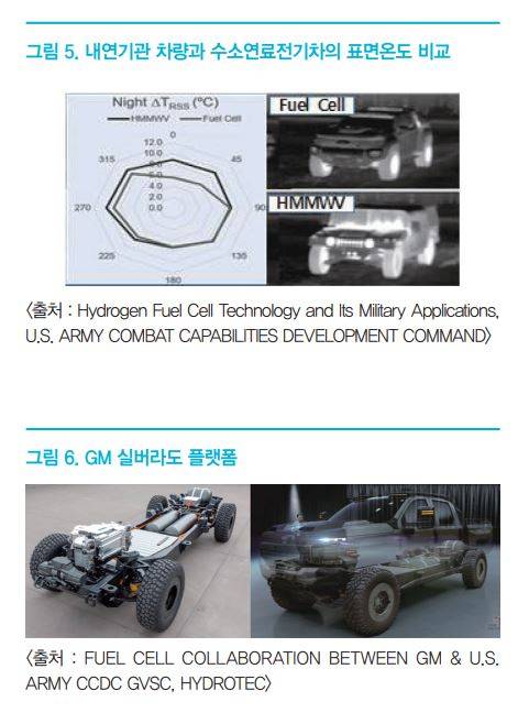 해외군의 사례에서 보듯이 군용차량에 내연기관을 수소연료전지로의 전환을 위해서 지속적인 시제품 개발과 전투실험을 통해 운용개념 및 전투지원을 발전시켜 나가고 있다. 수소전기차에 대한 해외군과의 기술격차를 줄이고 수소를 대체에너지원으로 활용을 통해 차량의 기동성, 항속거리, 기동소음, 발생열을 낮춰 기존 내연기관보다 적으로부터 탐지를 줄이는 기술적 장점을 극대화하여 신개념 군용차량 개발에 박차를 가해야 할 때이다.