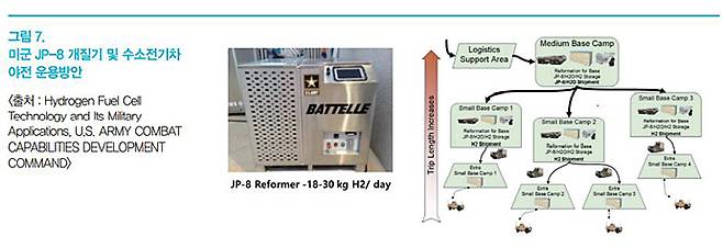 미군은 야전부대에서 수소전기차 운용을 위해서 사용연료인 JP8을 이용하여 수소를 추출하는 개질기에 대하여 시제품을 개발하여 성능을 검증 중에 있다. 개질기는 1일 기준 18~30kg H2 생산이 가능하고 야전부대 운용을 가능하게 한다.