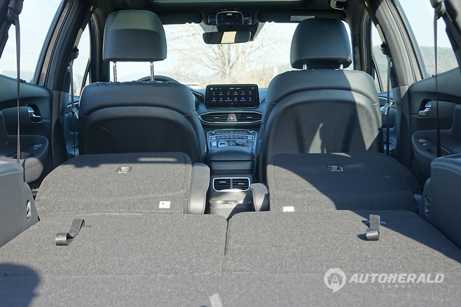 싼타페 6인승은 3열이 더 만족스럽다. 트렁크와 같은 바닥 높이 때문에 무릎이 불편하고 앞 공간이 좁지만 턱없는 정도는 아니다. 무엇보다 주변 장치가 완벽하다. 3열 공조를 따로 할 수 있는 다이얼 버튼이 있고 12V 충전 소켓, USB 포트, 컵홀더까지 갖췄다. 3열도 개별 폴딩이 가능하기 때문에 시트 하나만 접어도 충분한 화물 적재 공간이 나왔다.
