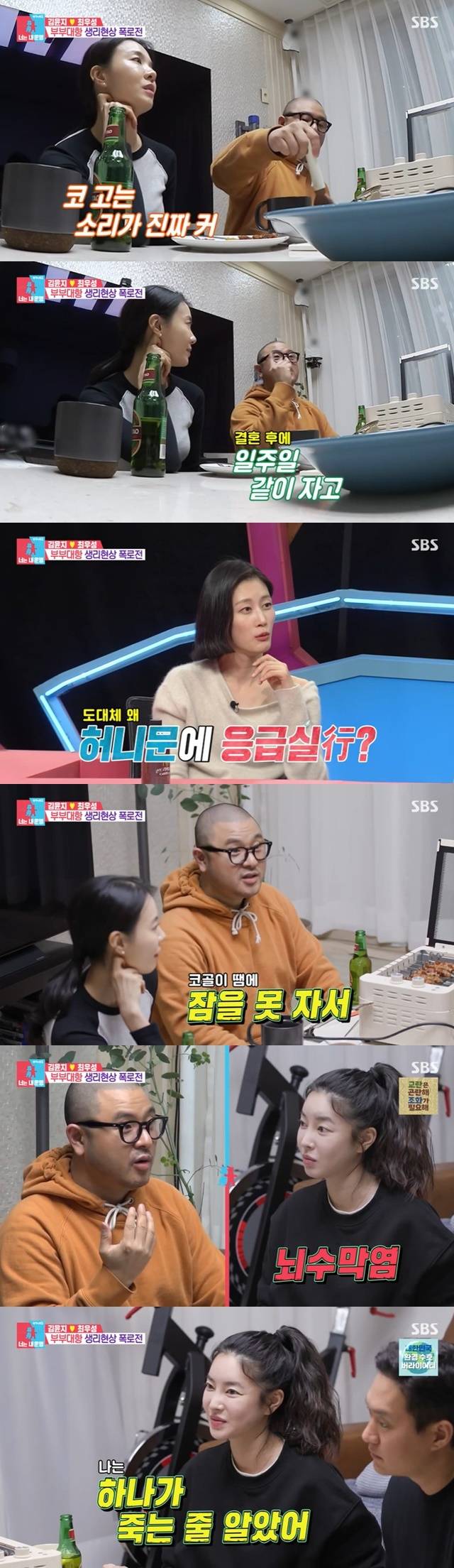 조하나는 남편 심태윤은 방귀 보다 코골이가 문제라며 “코 고는 소리가 진짜 크다. 집안이 울리는 것처럼 코를 곤다”고 말했다. 여기에 심태윤은 “결혼하고 신혼여행 다녀와서 일주일 같이 자고 (조하나가) 병원에 실려 갔다. 입원했다. 잠을 못 자서”라고 사연을 털어놨다.