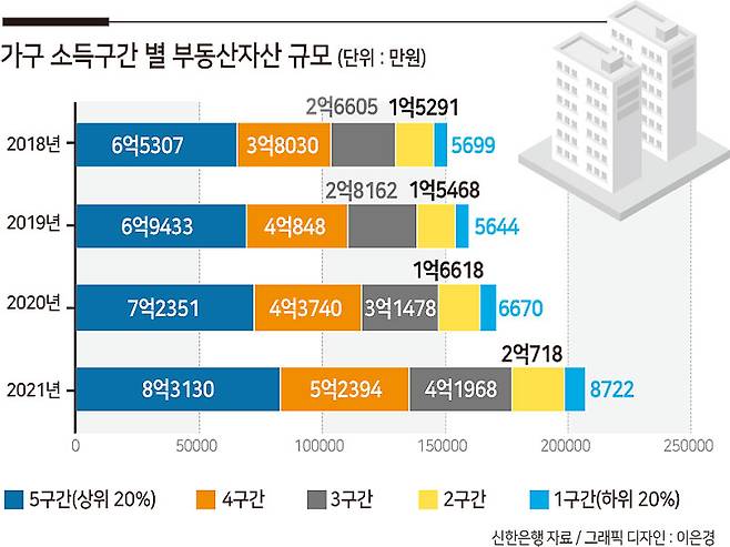 ▶고소득층 부동산, 저소득층보다 1.4억원 더 올라= 신한은행이 5일 내놓은 ‘2022 보통사람 금융생활 보고서’에 따르면, 부동산 자산 규모 상승은 소득이 높을수록 두드러졌다. 5구간(상위 20%)과 1구간(하위 20%)의 부동산 자산 규모 변화를 비교해보면, 5구간은 최근 4년간 1억6823만원 늘었지만 1구간의 경우 3023만원 증가하는 데 그쳤다. 차이만 봐도 5배에 달한다.