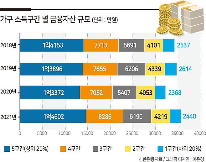 특히 소득 상위 40%는 2021년에 총소득이 크게 증가하면서 코로나19 이전인 2018년, 2019년보다 금융자산 규모가 커졌다. 금융자산이 전년 대비 각각 1000만원 이상 늘면서 중저소득에 비해 상승폭이 컸다.