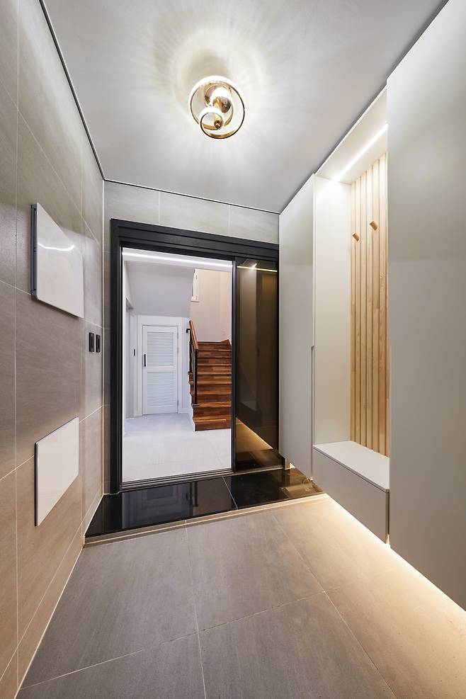 현관 우측에 맞춤 수납장을 설치했다. 신발장뿐만 아니라 간단하게 옷을 보관할 수 있도록 옷걸이장까지 마련해 편의를 더했다. 또, 밝은 색 우드 템바보드로 마감해 은은한 멋과 여유가 있다. 공간은 전체적 으로 화이트와 그레이, 우드 톤의 조화가 인상적이다.