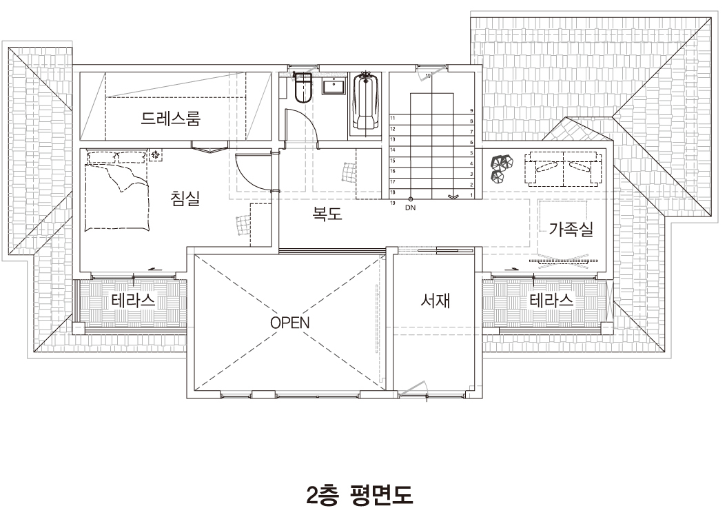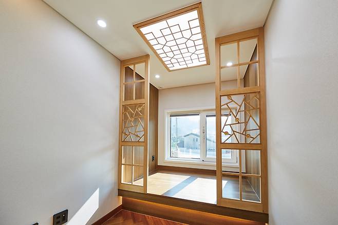 2층 계단실과 마주한 작은 공간인 서재는 바쁜 일상 중에도 잠시 햇살을 받으며 여 유를 느끼기에 충분하다. 작지만 깊은 질 감이 느껴지는 멋이 있다. 창 쪽에 단차를 둔 평상을 계획하고 양 옆으로 목재 프레 임 가벽을 설치해 한옥 느낌을 가미했다.