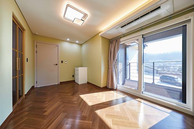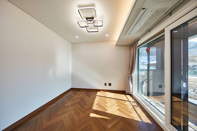 가족실은 2층 한쪽에 단독으로 배치해 가 족이 모이는 시간에 온전히 집중할 수 있 도록 했다. 실 앞쪽에는 테라스를 계획하 고 사이에 통창을 설치해 시선을 외부로 확장했다. 헤링본 패턴 강마루와 베이지 톤 실크 벽지가 안락한 분위기를 자아내 며, 천장 포인트 조명은 따뜻함을 더한다.