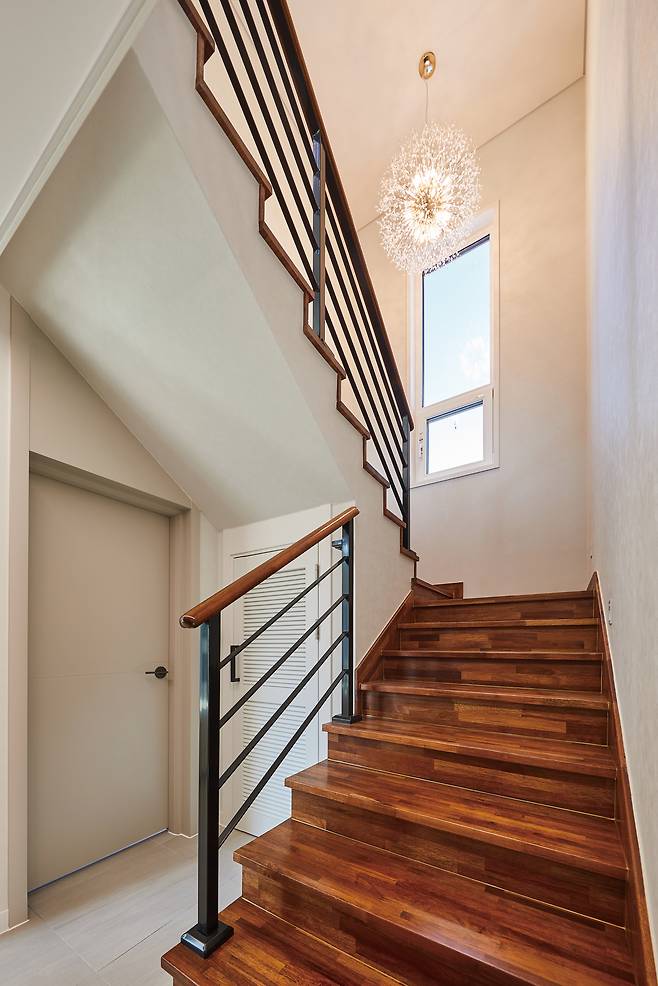 계단은 디딤판과 챌판에 짙은 원목을 적용 하고 블랙 평철 난간을 설치해 안전성을 확 보했다. 계단참 벽면에 창을 마련해 계단 을 오르내리며 햇살을 느끼도록 계획했다. 천장에는 디자인 조명을 설치해 화려한 느 낌을 주었다.