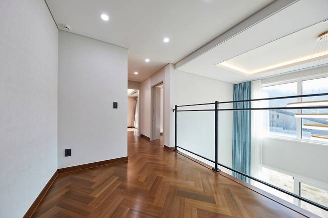 2층 복도는 각 실을 연결하는 허브 공간이 다. 강화유리 난간 너머로 1층 거실이 보이 고 창밖으로 시선이 이어져 공간감과 개방 감을 동시에 느낄 수 있다. 작지만 탁 트인 기분을 느낄 수 있어 매력적이다.