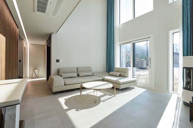 남향에 배치한 거실은 하이실링과 넓은 채광창으로 햇빛이 실내를 가 득 채운다. 아트월은 천연 대리석과 블랙 톤 석재타일을 적용해 대비 를 주고 간접조명으로 장식했다. 고지대 단점인 추위를 보완하고자 한쪽에 벽난로를 설치했다.