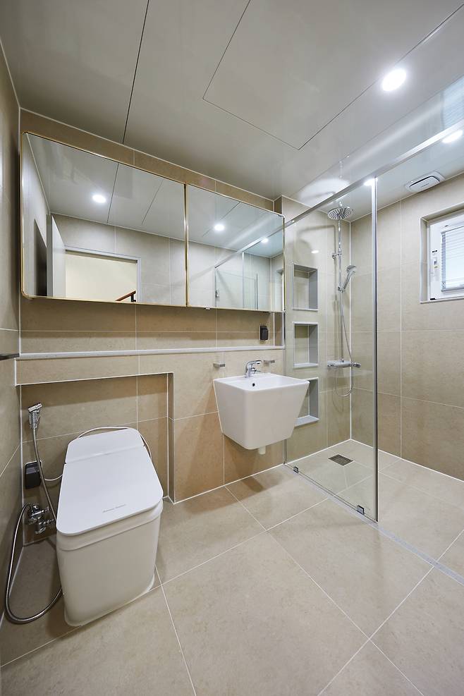 욕실은 1층 어디서든 접근이 용이하도록 평면 중심에 두어 동선이 편리하다. 구성 은 평소 화장실 사용이 많지 않은 건축주 의 패턴을 반영해 단출하게 처리했다. 베 이지 톤 벽타일과 골드 프레임 수납장 거 울이 과하지 않은 포인트를 선사한다.
