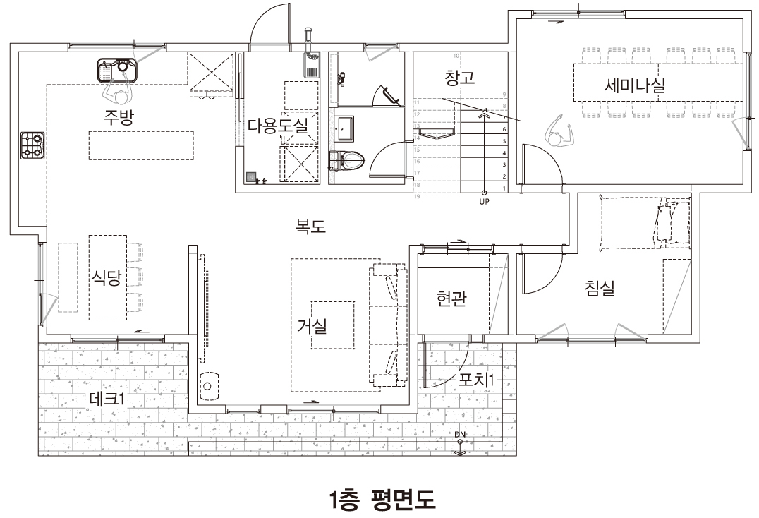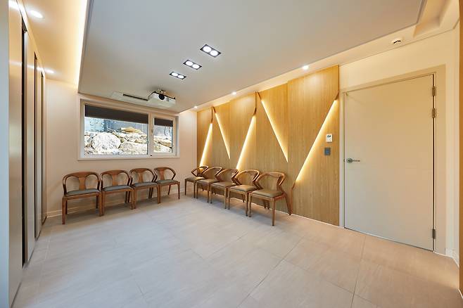 재택근무와 회의가 잦은 건축주의 업무 를 고려해 특별히 계획한 공간이다. 주택 이지만 실제 상업공간의 분위기를 담기 위 해 곳곳에 마련한 장치가 돋보인다. 한쪽 벽면을 목재 패널과 라인 조명으로 구성해 색다른 분위기의 공간으로 연출했다.