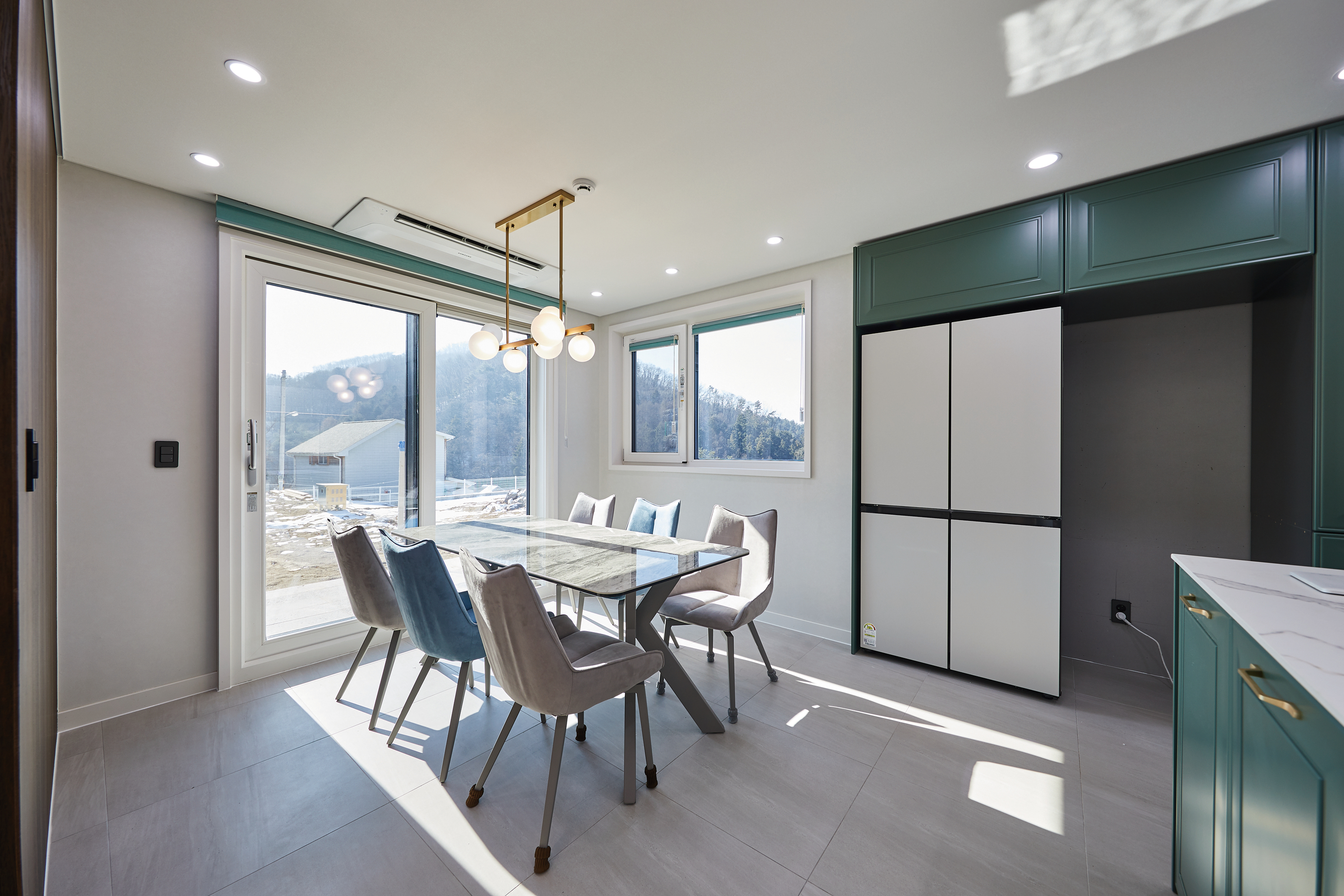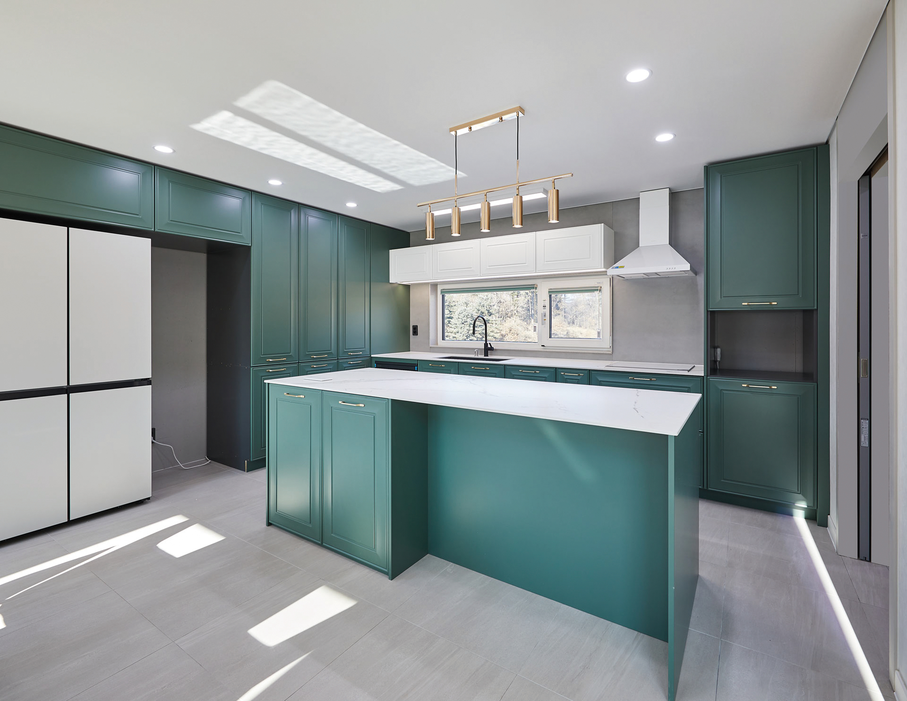 주방 가구는 병렬로 구성해 동선에 편의 를 도모했다. 식당 창과 주방 긴 창에서 들 어오는 빛이 브런치 카페와 같은 분위기를 연출한다. 올리브 그린의 가구 컬러와 대 리석 아일랜드 상판, 골드 조명이 다채로 운 공간감을 선사한다.