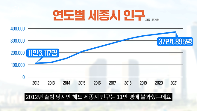 이 부분은 인구 증가율로 설명할 수 있습니다. 2012년 출범 당시만 해도 세종시 인구는 11만 명에 불과했는데요. 2021년 37만 명을 찍습니다. 10년도 채 되지 않아 무려 3배 이상 상승한 것입니다.