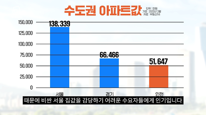 인천 아파트값은 2017년 처음으로 3억원대에 진입하더니, 2021년 초 4억원 돌파한 이후 불과 7개월 만에 5억원대로 올라섭니다. 현재 아파트값은 약 5억1,000만원입니다. 맞닿아 있는 서울과 경기보다는 훨씬 저렴한 가격입니다. 때문에 비싼 서울 집값을 감당하기 어려운 수요자들한테 인기입니다.