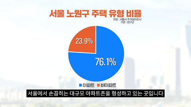 4위는 노원구입니다. 이곳은 아파트 비율이 75%를 넘는 곳으로, 서울에서 손꼽히는 대규모 아파트촌을 형성하고 있는 곳입니다. 1990년대 아파트 공급이 활발했고, 지금은 준공 30년이 넘어 재건축을 준비 중인 곳이 많습니다. 노후화된 소형 평형의 단지가 많다 보니까, 아파트값은 약 7억7,000만원 정도를 형성하고 있습니다.