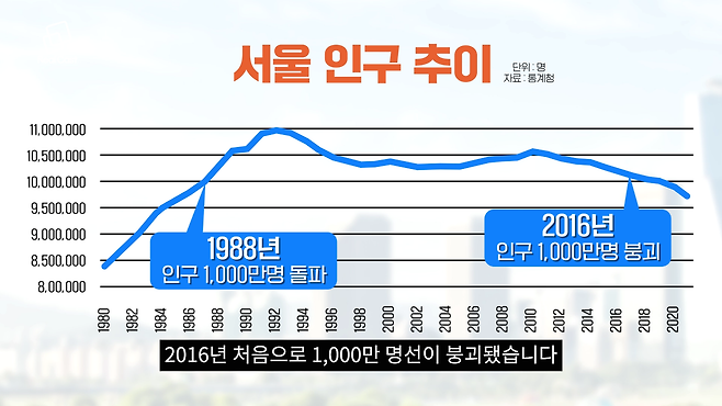 인구 많은 도시 2위는 서울입니다. 1988년 가장 먼저 인구 1,000만 명을 돌파했으나 1992년 정점을 찍고 오르락내리락 하더니, 2016년 처음으로 1,000만 명선이 붕괴됐습니다. 서울의 좁은 면적에 아파트 공급에 한계가 있었고요. 인근 경기도와 인천의 교통망이 좋아지고 신도시 택지가 조성되며 이들 지역으로 빠져나간 것이 인구 감소의 주된 요인입니다. 물론 서울의 '미친 집값'도 이유 중 하나입니다.