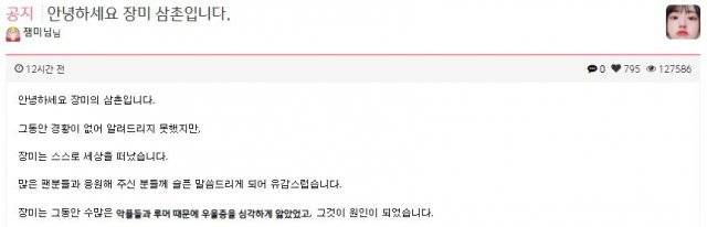 잼미의 아이디로 트위치에 접속한 누리꾼은 5일 잼미의 삼촌이라고 밝히며 “그동안 경황이 없어 알려드리지 못했지만, 장미는 스스로 세상을 떠났다. 많은 팬 분들과 응원해 주신 분들께 슬픈 말씀드리게 되어 유감스럽다”고 했다.