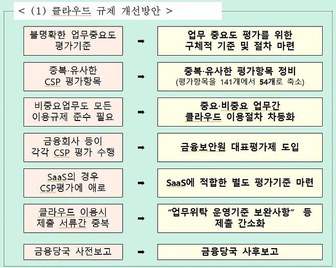 금융사가 클라우드를 이용하려면 ①업무중요도 평가 ②업무연속성 계획 수립 ③안전성 확보조치 방안 수립 ④업무위수탁기준 보완 ⑤클라우드서비스제공자(CSP) 안전성 평가 ⑥정보보호위원회 심의·의결 ⑦금융감독원 사전보고 등의 절차를 거쳐야 하는데, 각 단계에 대해 개선이 이뤄진다.