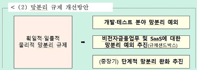 망분리 규제와 관련해서는 개발·테스트 서버에 대해서는 물리적 망분리 규제를 예외적으로 완화한다. 개인신용정보 등을 보유하고 있지 않고 전자금융거래의 중요성이 낮은 개발·테스트 서버까지 물리적 망분리가 일률적으로 적용되고 있어 개발·테스트의 효율성이 저해된다는 지적을 감안한 것이다. 다만 개인정보 유출 등 보안사고 발생을 최소화하기 위해 보완조치를 마련하겠다는 방침이다.