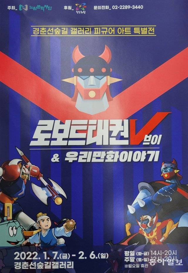 7080시대 추억의 만화영화 ‘로보트 태권브이’를 중심으로 ‘똘이장군’ ‘우뢰매’ 등 우리나라의 만화영화를 소개하는 ‘태권브이와 우리만화이야기’ 전시회가 서울 노원구 경춘선숲길 갤러리에서 명품 피규어 아트를 활용해 열리고 있습니다. 중장년 부모들에게는 추억의 향수를, 어린이들에게는 옛 만화영화의 신선함을 선사합니다.