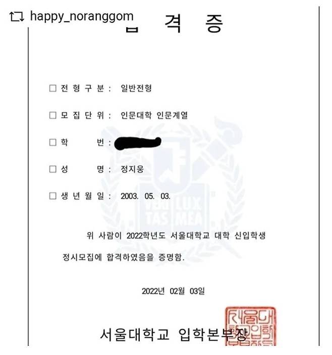 정은표는 지난 3일 정지웅의 인스타그램을 리그램하며, 아들의 서울대 합격을 온 동네에 알렸다. 특히 정지웅의 서울대 인문대학 합격증, 합격 수기도 뜨거운 화제를 모으고 있다.