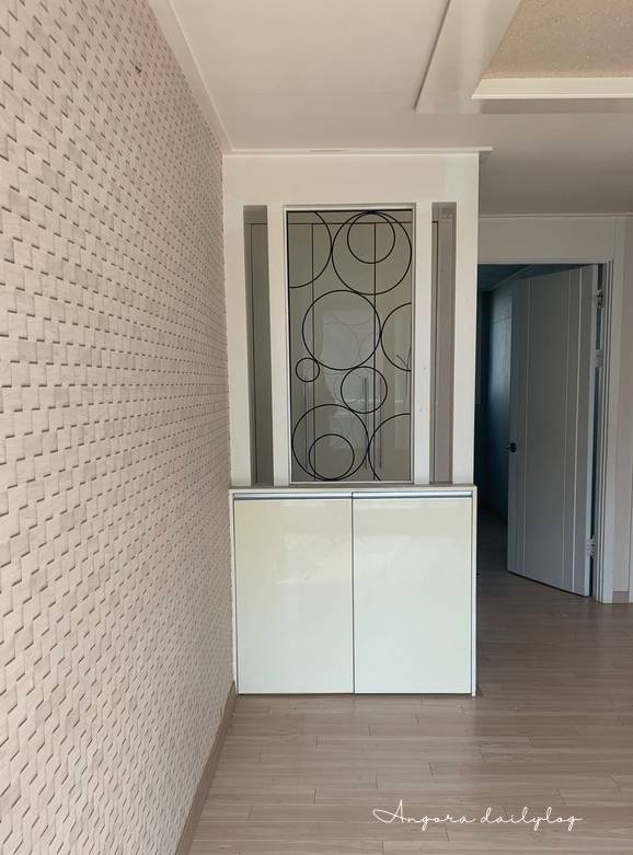 중문 가벽에 붙어 있는 기하학적인 원형 장식...ㅎㅎ 현관이 참 좁아 보였던 20평대 집. 중문까지 달면 답답해 보일 것 같아서 중문을 달지 말까 고민하기도 했었다.
