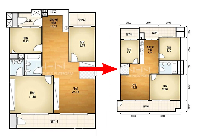 왼쪽 30평대 / 오른쪽 20평대. 이사하기 전 집은 33평, 지금은 23평 집이다. 둘 다 구축이어서 구조가 거의 똑같다. 20평대가 전반적으로 작긴 한데, 특히 주방이 심각하게 너무 좁았다. 30평대에서 쓰던 식탁을 둘 곳이 없음...