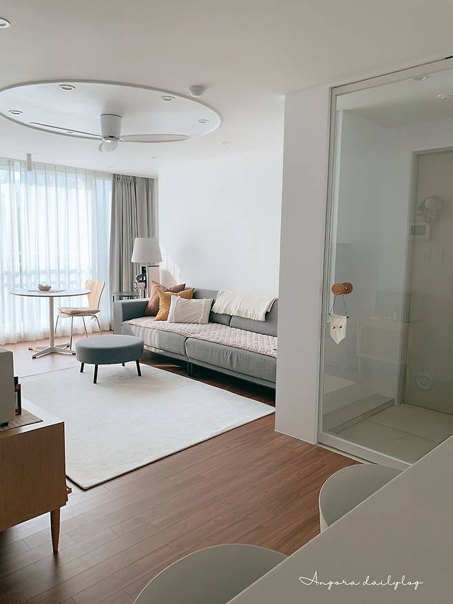30평대처럼 넓고 시원한 느낌은 없지만 20평대만의 아기자기함이 있다. 리모델링하면서 바닥은 짙은 우드 색을 선택했다. 나름 로망이었던 실링팬도 달았는데 완전 만족!