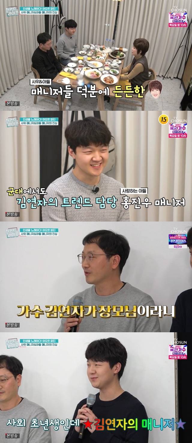 그는 “전역하자마자 바로 시작을 했다. 완전 사회초년생인데 대단한 분의 매니저를 해야 해서 부담감이 좀 있었다”고 털어놓기도 했다. 곧 김연자의 사위가 될 매니저는 “처음 뵀을 때 눈도 못 마주쳤다. 너무 젊으셔서 다른 김연자인가 생각할 정도로. 장모님으로 생각한다면 믿기지가 않는다”고 말했다. (사진=TV조선 ‘퍼펙트라이프’ 캡처)