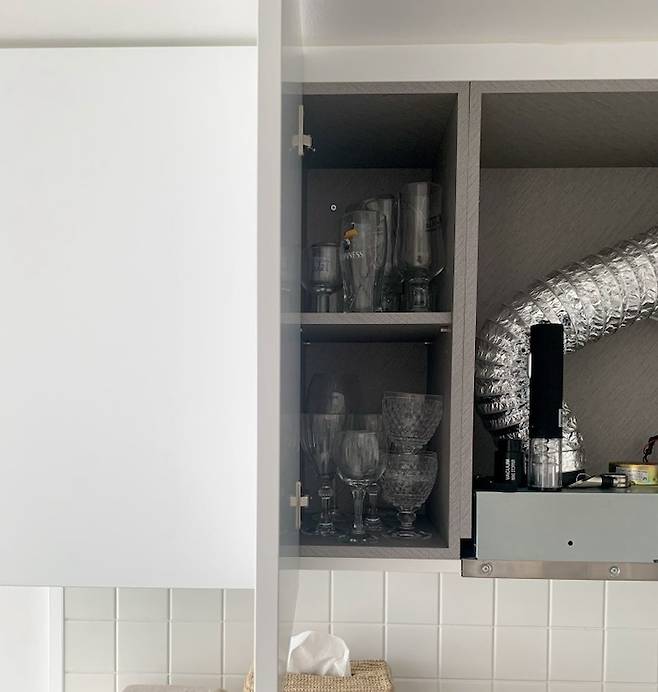 역시나 가장 위쪽 수납장에는 안쪽에 후드 연통이 통과해 깊이가 얕아요. 그래서 글라스와 작은 텀블러를 세워서 수납했어요.