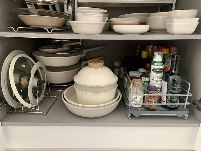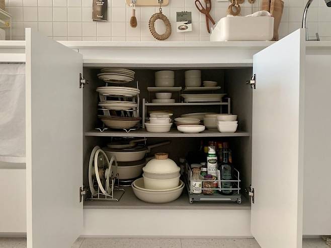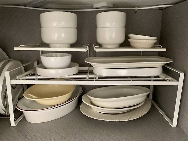 주변에서 정리 팁을 여쭤보실 때마다, 각자의 환경에 맞게 접시 정리대, 인출식 선반 등의 적절한 수납 용품을 활용하시라는 말씀을 꼭 드리고 있어요.