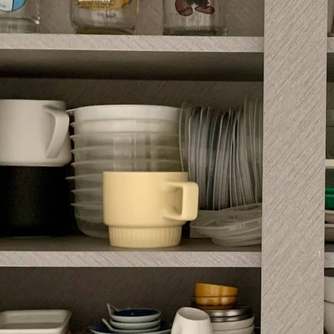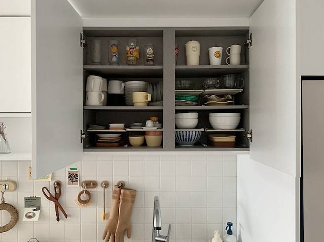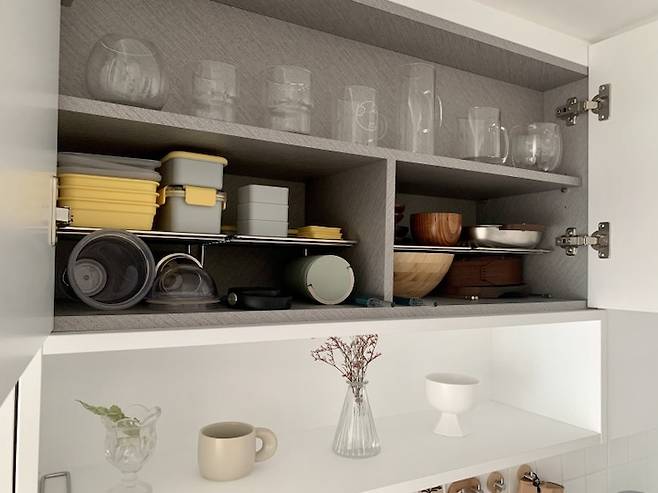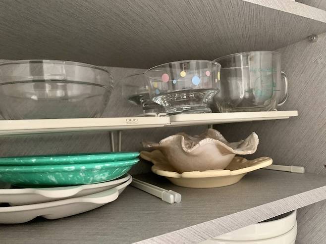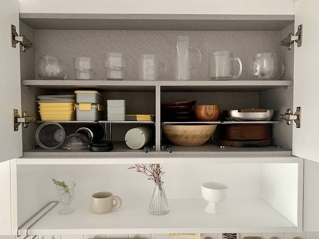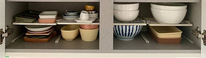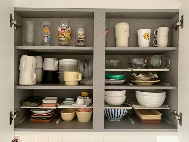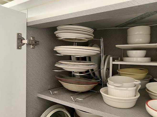 가장 위쪽 칸에는 유리잔을 수납하고, 그 아래 칸에는 접시 정리대를 활용해 공간을 분할해서 그릇을 수납하고 있는데요.