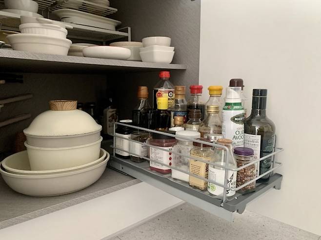 고양이의 오른쪽을 보시면 가루 양념 / 액체 양념이 각각 긴 바구니에 담겨져 있지요? 그런데 이렇게 사용하다 보니 안쪽 깊은 곳에 있는 양념을 꺼낼 때 불편함이 많았어요. 이게 항상 고민인 부분이었는데요.