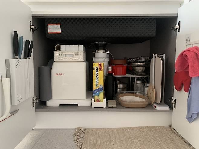 친구가 이사 선물로 음식물 처리기를 설치해 주었는데 꽤나 부피가 크거든요. (사진 속 왼편 하얀 기계) 차근차근 결과물 보여드릴게요!
