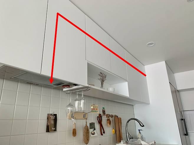그 이유는, 사진 속 화살표처럼 상부장 안쪽으로 주방 후드 연통이 지나가기 때문입니다. 리모델링 과정에서 조리대 위치를 바꾸면서 불가피한 선택이었어요 :)
