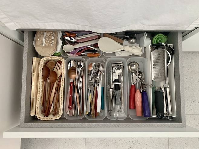 저희집 하부장 깊이가 얕은 편이라 기성 수저 트레이는 맞는 게 없더라구요! 그래서 작은 바구니를 여러 개 구매해 수저와 조리도구를 수납하고 있어요.