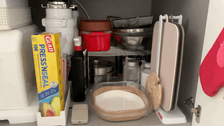 이것을 사용해서 공간을 위아래로 분할하여, 자주 안 쓰는 냄비와 특수 세제는 아래쪽에, 전자렌지 용기와 체, 찜기를 위쪽에 보관하고 있어요.