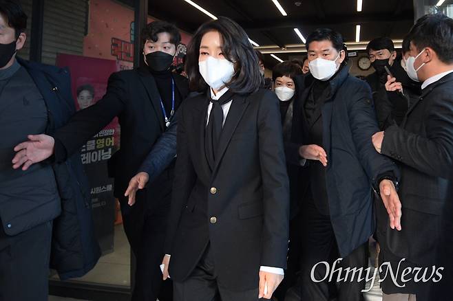 | ▲ 윤석열 국민의힘 대선 후보의 배우자 김건희 씨가 26일 오후 서울 여의도 국민의힘 중앙당사에서 '경력 부풀리기' 의혹에 대한 사과 입장을 밝힌 후 당사를 나서고 있다. |