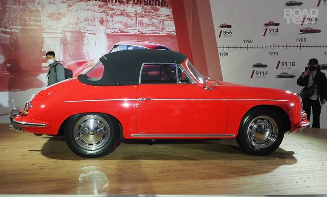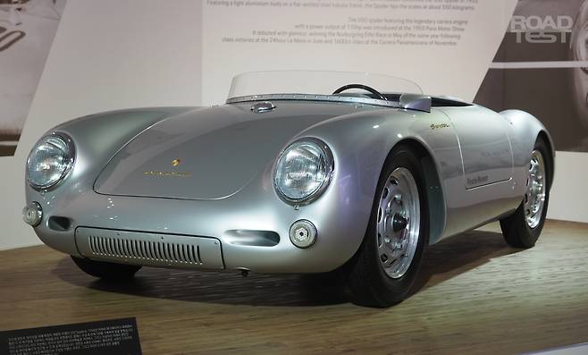 ‘헤리티지 존’에 들어서자, 포르쉐 배지를 처음 단 356을 비롯해 550 스파이더, 구형 911 등 클래식 포르쉐 7종이 기다리고 있었다. 가장 먼저 눈에 들어온 차는 356A 스피드스터. 폭스바겐 비틀을 밑바탕 삼은 포르쉐 최초의 양산차다. 1열 시트 뒤에는 공랭식 수평대향 4기통 1.6L 가솔린 엔진을 얹었다. 최고출력 75마력, 최고속도는 시속 175㎞다.