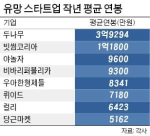 14일 한국경제신문이 국내 주요 유니콘 기업(기업 가치 1조원 이상 스타트업)과 예비 유니콘 기업 15곳의 사업보고서와 감사보고서를 분석한 결과 이들 기업의 평균 연봉은 9340만원으로 집계됐다. 지난해 지급된 급여 총액에서 지난해 말 기준 직원 수로 나눈 것이다. 최근 인크루트가 분석한 국내 시가총액 상위 50개사의 평균 연봉인 9400만원과 비슷한 수준이다.